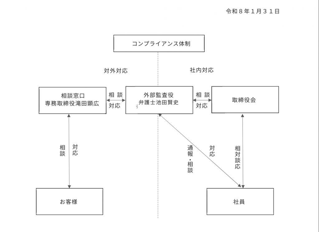 当社は、企業としての社会的責任を果たし、法令遵守および高い倫理観に基づいた事業活動を推進するため、コンプライアンス体制の整備を行いました。本体制のもと、コンプライアンス意識の向上、リスクの未然防止、適切な対応・是正を図り、健全で透明性の高い経営の実現に努めてまいります。今後も、ステークホルダーの皆さまから信頼される企業であり続けるため、継続的な体制の強化と改善に取り組んでまいります。
